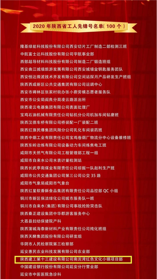 近日,陜西省三秦工匠、五一勞動獎表彰大會在西安隆重舉行,會議表彰了2020年三秦工匠 和陜西省五一勞動獎、工人先鋒號。陜西建工第十三建設有限公司南泥灣紅色文化小鎮(zhèn)項目部榮獲2020年“陜西省工人先鋒號”榮譽稱號。