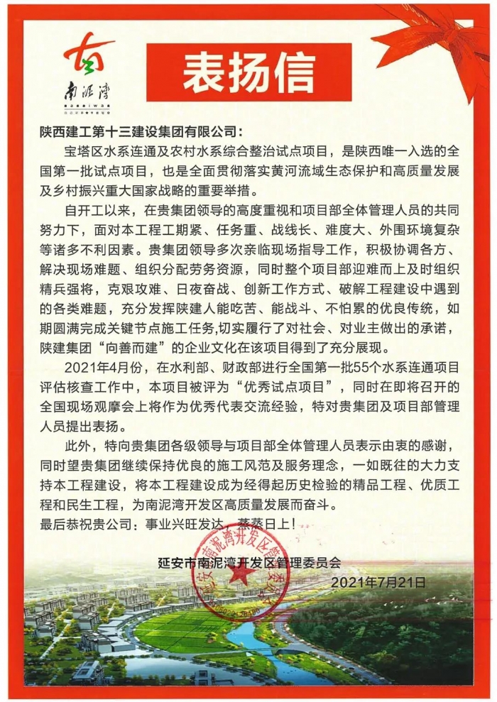近日,陜建十三建集團收到了來自南泥灣開發(fā)區(qū)管委會的表揚信。信中,對集團寶塔區(qū)水系連通及農(nóng)村水系綜合整治試點項目全體管理人員表示了高度贊揚。