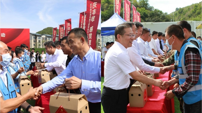慰問活動(dòng)現(xiàn)場,與會(huì)領(lǐng)導(dǎo)為農(nóng)民工朋友們發(fā)放慰問品,并隨后觀看了“慶豐收、感黨恩”慰問演出。