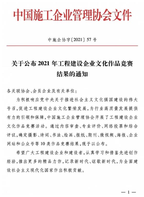 近日,中國施工企業(yè)管理協(xié)會(huì)公布了2021年工程建設(shè)企業(yè)文化作品競賽獲獎(jiǎng)名單。陜建十三建集團(tuán)企業(yè)官網(wǎng)和微信公眾號(hào)分別榮獲優(yōu)秀獎(jiǎng)。