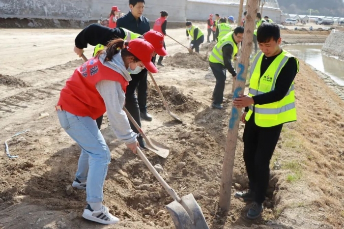 活動現(xiàn)場,大家熱情高漲、干勁十足,三五人一組,分工合作,揮鍬鏟土,放置樹苗,提水澆灌,踏土正苗,每道工序都有條不紊,到處一片熱火朝天的勞動場景。經過2個多小時的辛勤勞動,一排排綠柳整齊地挺立在河道兩旁,為紅色南泥灣增添了一抹新綠、播種了一份希望。